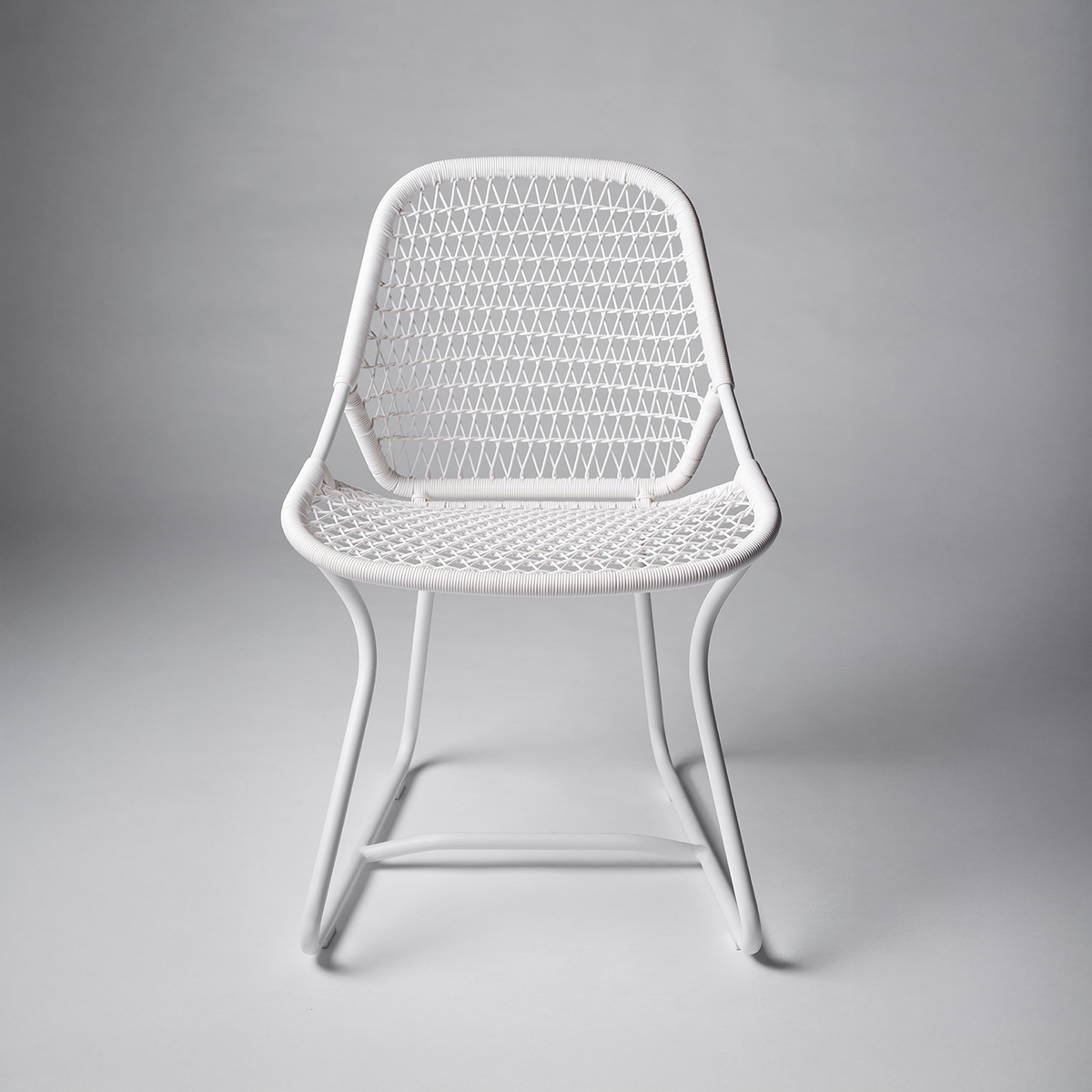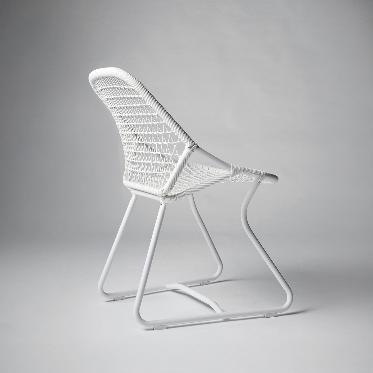 Sixties réinvente les fauteuils coques en rotin des années 1950-1960, en les revisitant dans une version en fibre tressée et aluminium, alliant légèreté et esprit pop.