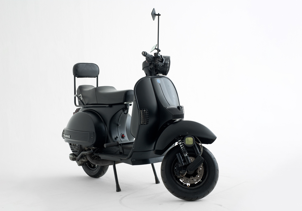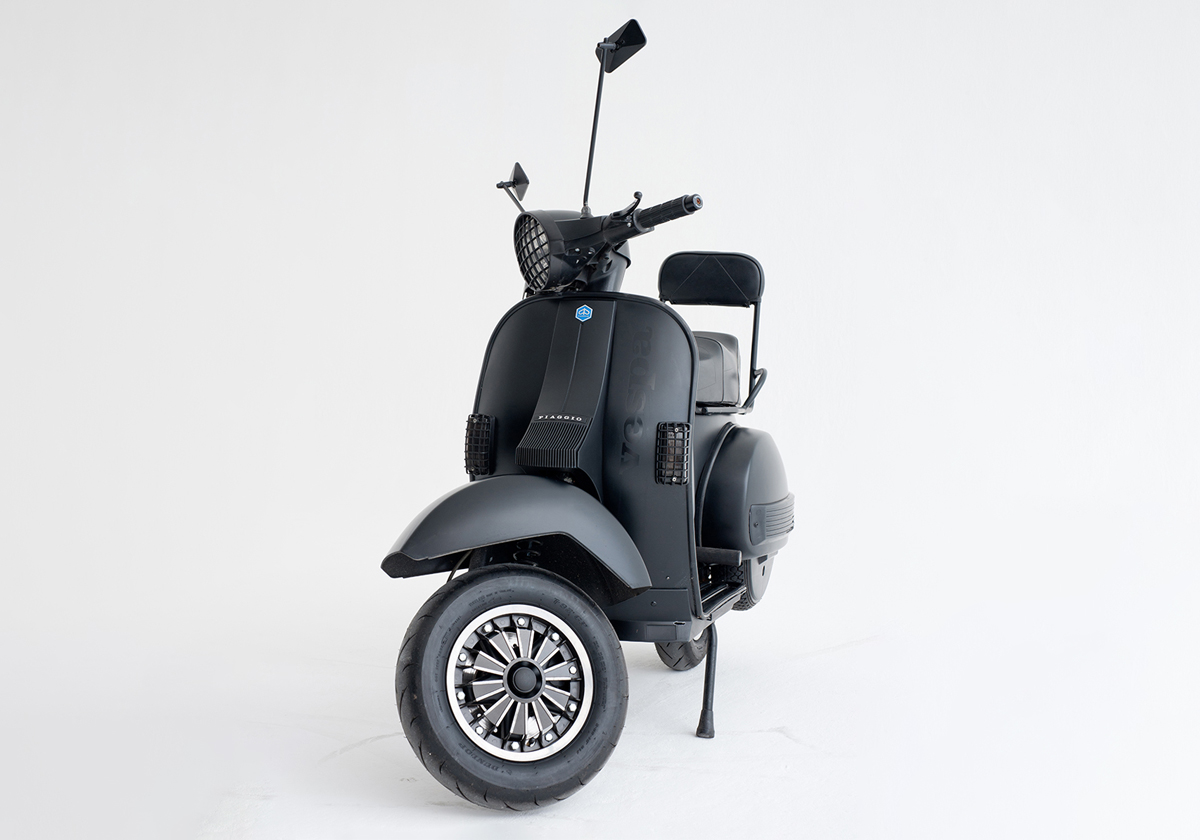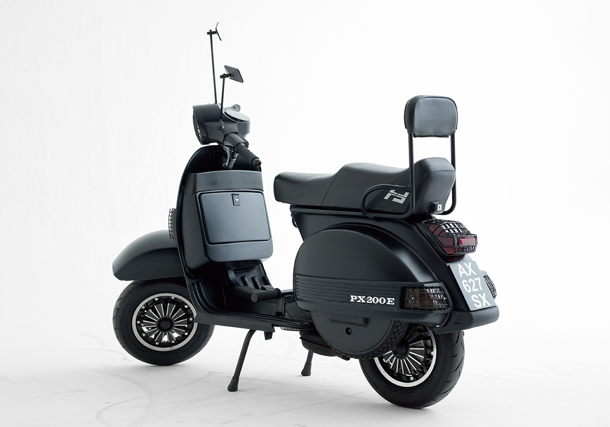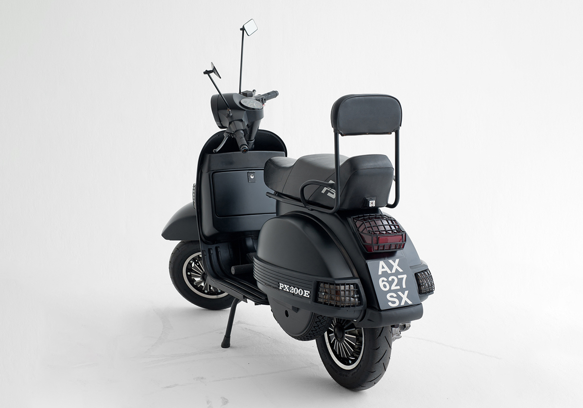 Hommage appuyé à la culture Mods et aux mémorables scooter boys des années 80, Pimp my PX passe à la moulinette de son imaginaire pour devenir un bolide personnalisé de fond en comble. Des grilles à la descente de klaxon, noir mat et équipé d’accessoires hyper codés, le « scoot » accapare le regard — extrêmement stylé, autant chic que punk — un salut respectueux au mythe Quadrophenia.